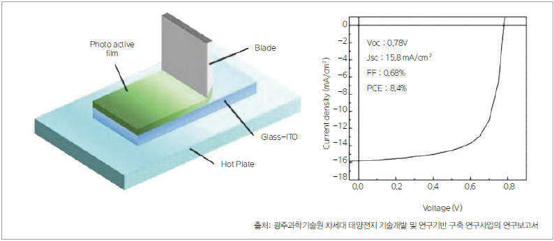 ▲ 그림 6. 인쇄 공정을 통한 광활성층 형성 모식도 및 혼합잉크를 통한 인쇄 소자의 J-V 특성