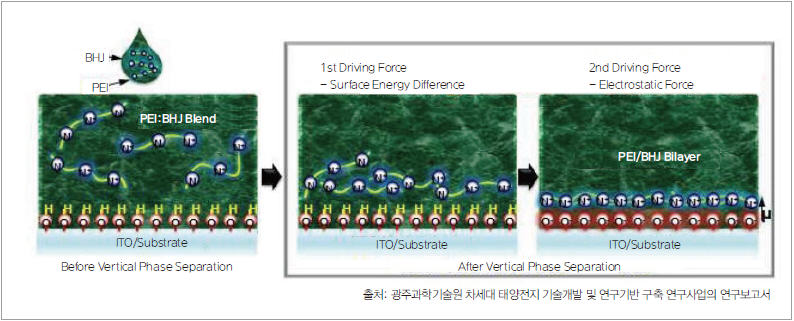 연구팀은 기능층 물질의 분자량에 기인한 자가상분리 성질 차이를 규명함으로써, 혼합잉크의 자가상분리를 확인 후, Doctor Blade를 이용하여, 혼합잉크로 8% 이상의 단일층 소자를 구현한다.