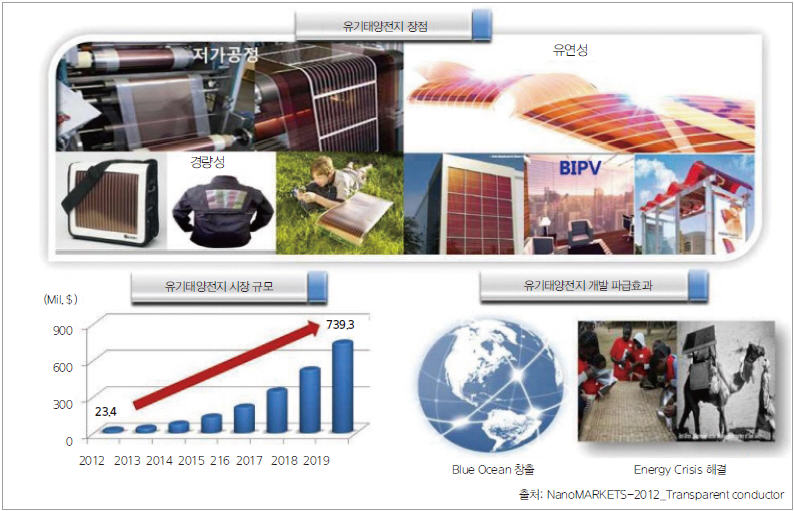 제작이 간단하고 인쇄가능하며 구부리거나 접을 수 있는 유기물 태양전지는 차세대 저가형 신재생 에너지원으로서 뿐만 아니라 미래의 유비쿼터스 에너지원으로 각광받고 있는 실정이다.