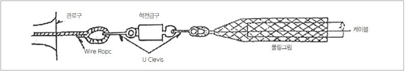 케이블 포설시 Wire Rope와 관내부의 비닐피복철선과의 연결상태를 확인해야 한다. Pulling Eye와 Wire Rope 사이에는 회전금구를 사용해 연결해야 한다.