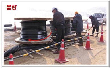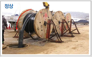 하지만 케이블이 드럼에 감겨져 있는 방향과 인입방향을 무시하고 단순히 세워서 시공하는 것으로 시공기준을 만족 한다고 볼 수 없다. 그림 11처럼 세워서 시공하는 방법은 케이블이 감겨진 반대 방향으로 인입 되게 되어 중성선이 꺽이고 외피가 부풀어 오르는 현상이 발생 할 우려가 있다. 나아가 이러한 인입 방향은 드럼에 감긴 케이블을 선출 인입 할 때 인입장력 과도하게 상승해 케이블 포설장력 증가의 원인이 된다.