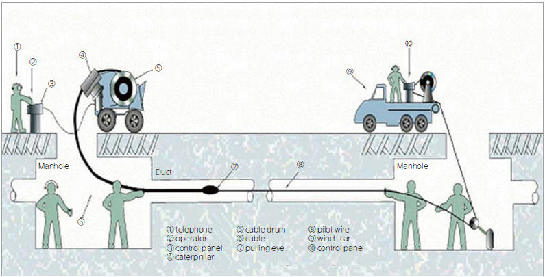 관로에 케이블을 포설하는 공정은 크게 케이블을 당기는 쪽 맨홀과 인입쪽 맨홀 작업으로 구분된다. 케이블을 당기는 맨홀 쪽의 작업공정은 「케이블 풀러 설치 → 6㎜PP로프 →굵은 로프로 교체(14mmPP로프) → 포설용 로프 → 케이블 포설」 순서로 진행한다.