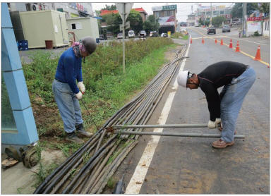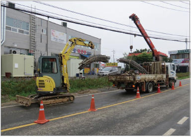 도로변에 철거된 케이블을 회수하기 위해서는 그림 13과 같이 두명이 한 조가 되어 큰 수동 컷터로 철거된 케이블을 약 3m 씩 절단해 묶는다. 도로에 철거되고 절단된 케이블은 다시금 차량에 상차하기 위해 수십 개씩 간추려 묶고 카고 크레인을 이용해 상차 후 철수하게 된다.