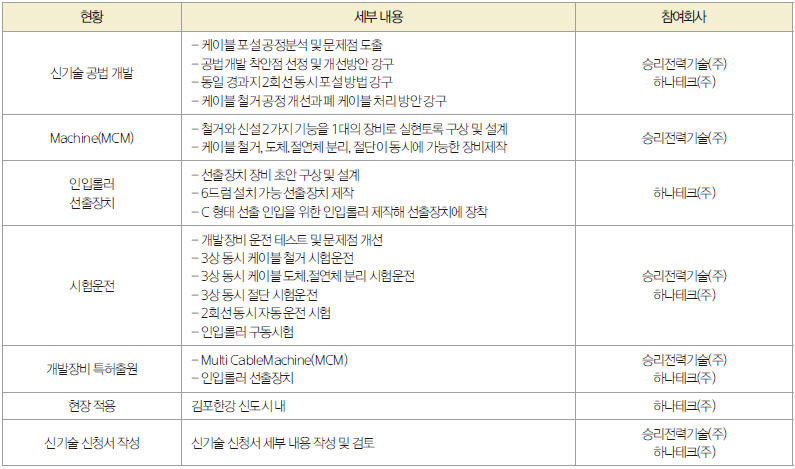 위와 같은 문제점을 보완하고 개선하기 위해 자동 2회선 동시 포설이 가능하고, 최소 작업 공간에서 케이블 빼내기, 절단, 회수, 나아가 폐 케이블 재활용을 용이하게 하기 위해서다. 도체와 절연체를 분리하는 작업을 한 장소에서, 한 대의 장비로 가능하게 한 시공방법을 개발하게 됐다.