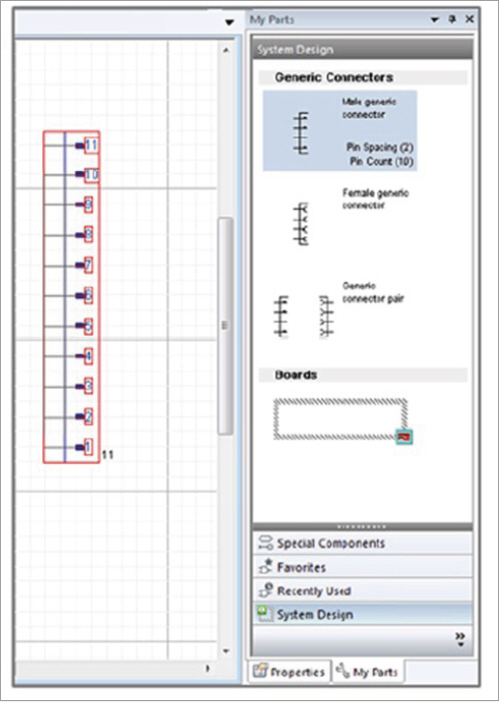 이 툴은 커넥터 확장 기능으로 파라미터화된 커넥터(IEC 규격을 따르는)를 즉석에서 생성하고(그림 6), 간단한 확장(stretch) 명령을 이용해 핀 번호를 수정해 주므로 커넥터를 추가하고 조작 및 갱신하기 위한 노력이 최소화 된다. 고도의 자동화 수준 덕분에 디자이너는 커넥터의 실제적인 물리적 세부사항에 신경 쓸 필요 없이 일반 커넥터를 이용해 커넥티비티를 생성하고 수정할 수 있다.