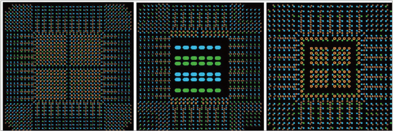직교 지역 (1). 직교방향으로 나열한 핀은 제 1구역과 2구역의 팬아웃이 합해질 때 충돌이 일어날 수 있다. 그림 5에 있는 예는 패턴의 병합은 물론, 중앙선을 기준으로 떨어진 바이어스를 보여주며, 직교방향으로 보다 큰 경로를 제공하고 있는 모습을 보여준다.