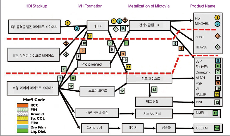 그림 9에 현재 사용되는 HDI 기술을 구성하는 네 가지 요소가 나와 있다: 비아 스택업, 유전체, IVH 구성 물질, 그리고 z-축 비아 연결의 금속화 기법에 관한 부분이다. 최근 몇 년간, 14가지의 여러 고급 HDI 공정을 활용하였다.