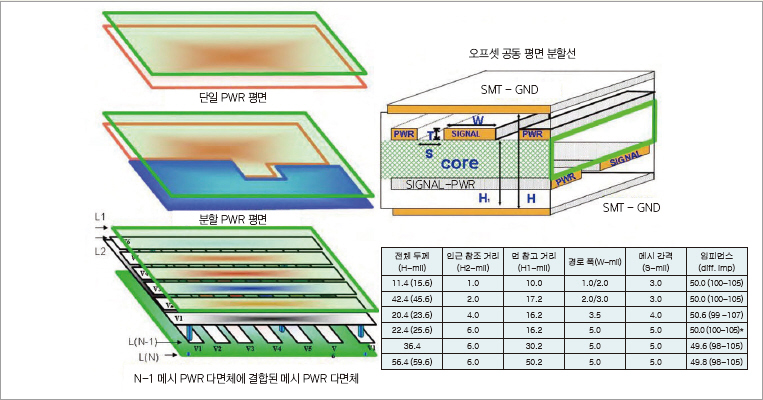 즉, 두 개의 직교 레이어를 사용하여 파워를 ‘메시 구조’로 분산시키고 서로 다른 전압간 신호를 활용한다. 그림 13c에 이에 관한 내용이 나와 있으며 별도의 GND 레퍼런스가 있는 ‘이중 오프셋 공면 스트립 선로’라고 한다 (그림 13d). 라인 폭과 유전체 거리는 일반적으로 사용하는 다양한 임피던스에 대해 제공된다. 이러한 구조는 낮은 크로스토크를 갖는 장점이 있지만 보다 중요한 것은 ‘LAYER_2’에서 ‘LAYER_N-1’까지 블라인드 비아만을 사용해 루프 지역을 작게 유지할 수 있도록 모든 컴포넌트에 전압을 제공한다는 것이다.