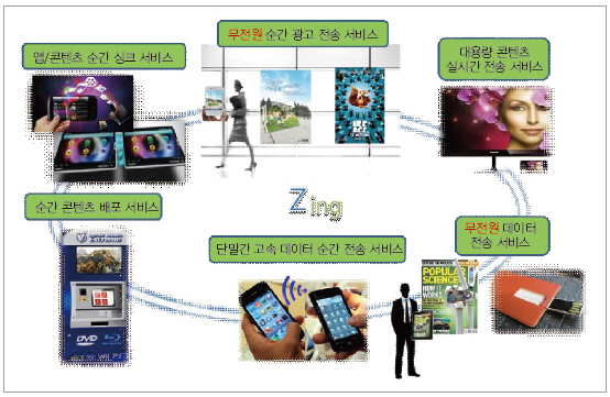 징 기술은 직관적 인터페이스를 통해 기가급 콘텐츠를 기기 간에 순간 전송할 수 있어 사용자 주변의 스마트폰, 카메라, 노트북 등에 사용할 수 있다. 그뿐 아니라 TV, 냉장고 등 스마트 가전기기, 차량용 인포테인먼트, 쇼핑몰 또는 거리의 스마트 IoT 광고, 지하철 키오스크 등 다양한 제품과 서비스에도 접목할 수 있다.