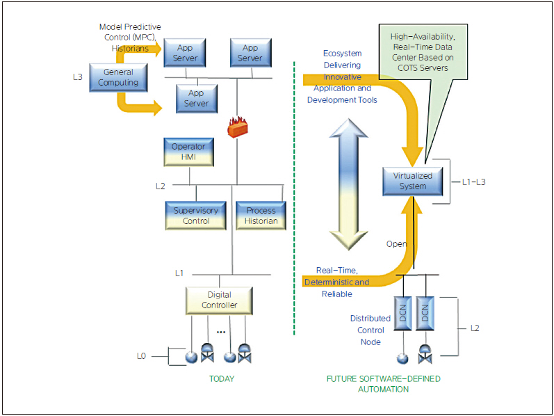 이러한 IT 개념이 현재 소프트웨어 정의 자동화, 즉 SDA (software-defined architecture)라는 추세로 산업 자동화에 적용되고 있다. 전제는 ISA-95 모델의 L1-L3 계층에서 볼 수 있는 기능들 대부분이(그림 2 참조) 산업 환경의 실시간 성능 요구사항을 충족할 수 있는 COTS 서버에서 실행 가능하다는 것이다. 이는 오늘날의 독점적인 사유 자동화 솔루션에 사용되는 개별 L1-L3 제품을 IT 데이터 센터와 동일한 혜택을 제공하는 서버에 통합할 수 있음을 의미한다. IT와 마찬가지로 SDA는 공개 표준과 공개 플랫폼을 활용하고 이를 확장하여 산업 요구사항을 충족하면서 OpEx와 CapEx를 절감하고 IT 클라우드의 이점을 보장한다.