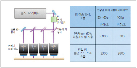 현재 고출력 UV 레이저의 잠재력을 극대화하는 여러 방법이 있다. 효율적인 처리를 위한 최적의 에너지가 최대 레이저 평균 출력에 대해 설계된 PRFnom에서의 에너지보다 훨씬 낮은 경우, 빔을 다수의 저 에너지빔으로 나누어 이들을 다중 프로세스 헤드로 보내는 게 타당할 수 있다(그림 4a에서와 같이).