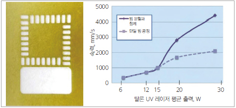 예를 들면, 그림 4b는 단일 빔/높은 PRF 대 50W UV 레이저 시스템을 사용하는 지름이 50μm~100μm인 ABF 블라인드 바이어스 천공에 대한 분할 빔 구성 사이에서 효과적인 비아 천공률을 나타내는 표를 포함하고 있다. 최근 30W 버전의 레이저에서 처리량은 15W 모델과 비교할 때 거의 두 배로 늘어났다.