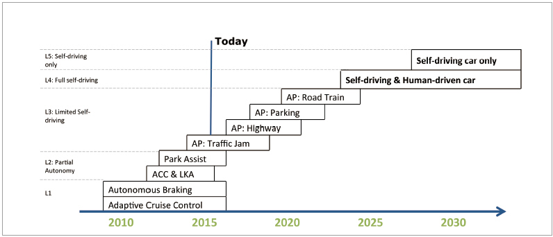 오늘날의 자동차에서 첨단운전자지원시스템(ADAS)을 탑재하고 자율주행차로 이행하는 데에는 여러 단계가 있다. 자동차 업계는 이미 첫 번째 단계인 부분적 자율 주행에 도달했지만, 완전 자율주행차는 2025년 이후나 돼야 가능할 것으로 예상된다.