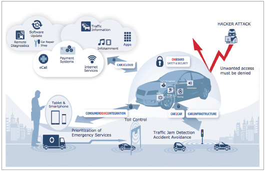 자동차와 주변 환경 간의 증가하는 공생은 차량의 경계를 넘어 많은 기회를 제공한다. 차량간(V2V) 및 차량과 인프라간(V2I) 통신과 같은 새로운 기술은 자율주행차를 강력하게 지원한다. 장점은 명백하다. 증가하는 운전자 편의성 외에도 이러한 기술이 보급되면 교통사고 사망자를 최대 90%까지 예방할 수 있을 것으로 추산되며, 환경적인 정보는 운전 전략을 향상시키고, 그에 따라 연료 소비를 감소시킨다. 자동차에 대한 영구적인 무선 액세스는 새로운 사업 모델의 가능성을 열어준다. 일례로 원격 소프트웨어 업데이트를 제공해 많은 비용이 드는 리콜을 최소화할 수 있다. 그러나 동시에 외부에서 자동차에 액세스할 수 있는 가능성은 모바일폰, 블루투스 또는 와이파이 등을 통해 해커 공격의 위험(그림 3)을 증가시킬 수 있다.