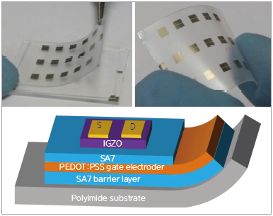 위에서는 스핀코팅 용액공정이 가능하며, 폴리이미드 기판과 SA7 게이트 유전물질의