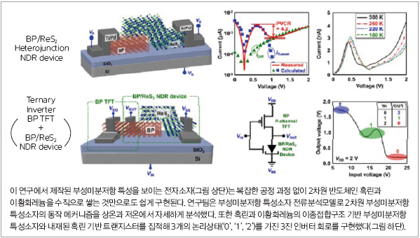 2차원 반도체인 흑린과 이황화레늄을 수직으로 쌓아 부성미분저항 특성을 보이는 전자소자를 제작하고, 연구팀이 개발한 부성미분저항 특성소자 전류분석 모델을 이용해 부성미분저항 특성소자의 동작 메커니즘을 상온과 저온에서 자세하게 분석했습니다. 또한 초절전형 전자소자의 응용 가능성을 확인하기 위해 흑린과 이황화레늄의 이종접합구조 기반 부성미분저항 특성소자와 내재된 흑린 기반 트랜지스터를 집적해 3개의 논리상태를 가진 3진 인버터 회로를 구현했습니다.