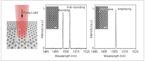 그래핀에 의한 국소적 광이득/손실 분포의 구현 여부를 확인하기 위해, 그래핀을 적용하기 전과 후에 각각 레이저 특성을 스펙트럼과 모드이미지 분석으로 관찰했다. 그래핀 적용 전 광결정 공진기는 결합/비결합의 두 가지 고유모드 레이저 특성을 보인 반면, 그래핀 적용 후에는 단일 고유모드 레이저 특성을 보였다.
