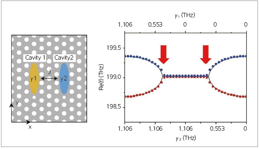 박홍규 교수 연구팀(고려대)은 광결정 공진기에 부분적으로 그래핀을 덮어 광학적 이득과 손실이 공진기 안에서 공간 분포를 갖도록 했다. 그래핀이 공진기를 덮는 넓이를 효과적으로 제어하여 공진기 내 고유모드의 특이점을 직접적으로 관찰할 수 있었다. 나아가 그래핀의 광 흡수 특성을 전기적으로 조절함으로써 특이점이 효과적으로 제어될 수 있음을 보였다.