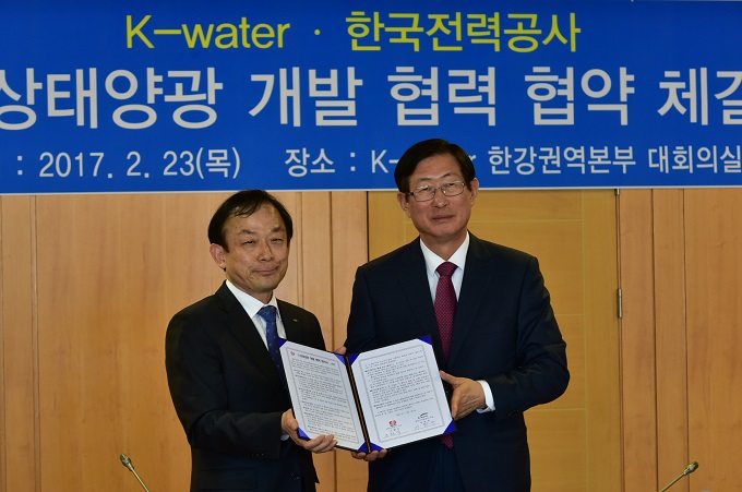 한국전력(사장 조환익)은 23일 경기도 과천시 한국수자원공사 한강권역본부에서 한국수자원공사와 수상태양광 개발 협력을 위한 협약을 체결했다.
