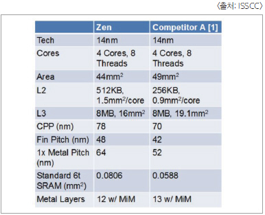 애널리스트 등 업계 관계자는 “Zen 코어는 매우 높은 경쟁력을 가지고 있다. 하지만 AMD에 있어서 다이 크기를 축소하는 것이 저비용화의 실현으로 이어질지는 현재 아직 밝혀지지 않은 수많은 변수에 의해서 결정될 것”이라고 말했다. 논문에 따르면, AMD가 이번에 채용한 기술은 기존 칩에 비해 스위칭 용량을 15% 줄일 수 있다. 예를 들어 Zen은 AMD에게 처음으로 MIM(metal-insulator-metal) 구조의 커패시터를 사용함으로써 동작 전압의 감소와 코어 당 공급 전압의 증가, 주파수 제어 기능의 향상 등을 실현할 수 있었다고 한다.