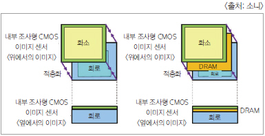 ▲ 왼쪽은 기존의 적층형 CMOS 이미지 센서, 오른쪽은 DRAM을 적층한