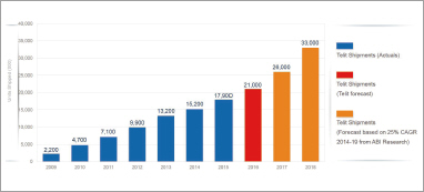 ▲ 텔릿의 IoT/M2M 모듈 판매 수량 및 전망치