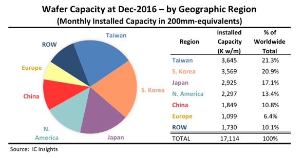 IC 인사이트에 따르면, 대만의 점유율은 2015년의 21.7 %에서 21.3%로 소폭 감소했다. TSMC와 UMC가 대만 전체의 73%를 차지하고 있다. 한국은 2015년 20.5%에서 20.9%로 점유율이 늘어났다. 삼성전자와 SK하이닉스가 한국 전체 생산 능력의 93%를 차지하고 있다.