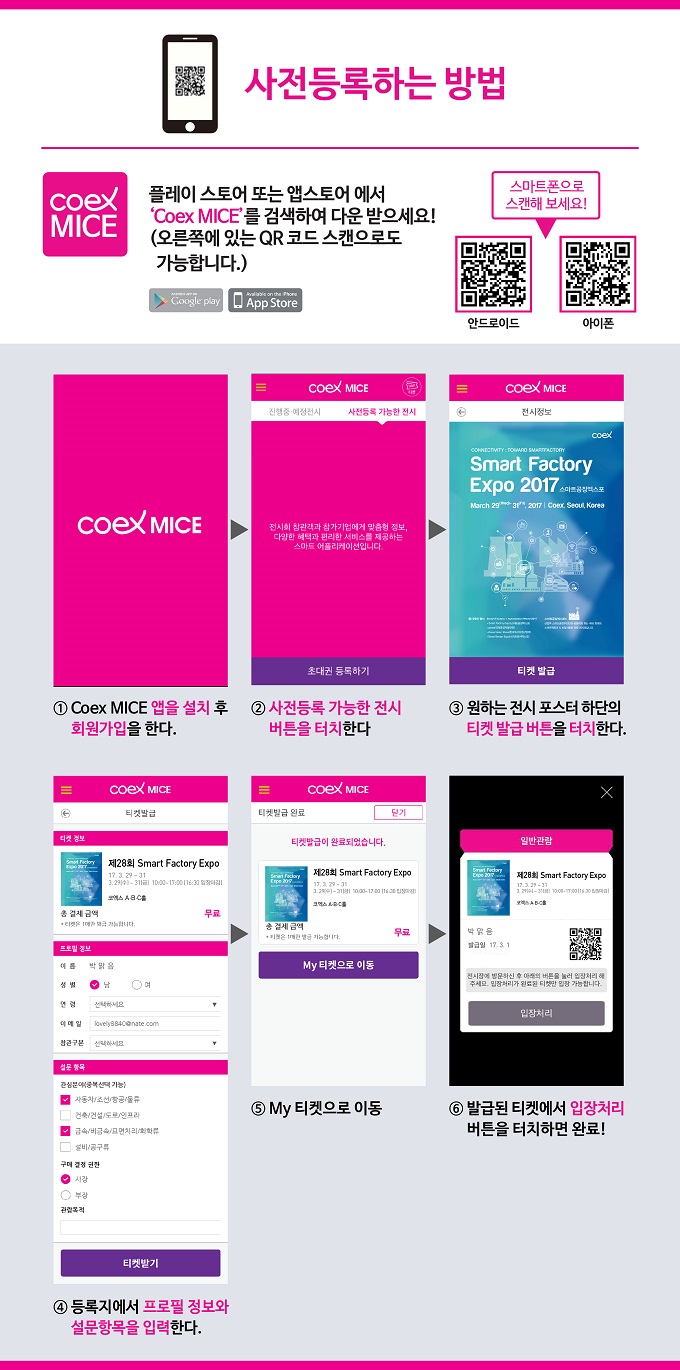 구글 플레이 스토어 또는 애플 앱스토어에서 ‘Coex MICE' 앱을 설치한 후 사전 등록을 하면 된다. 모바일에서 사전 등록한 이들은 전시장에서 줄서지 않고 모바일 티켓으로 전시장에 바로 입장이 가능하다.