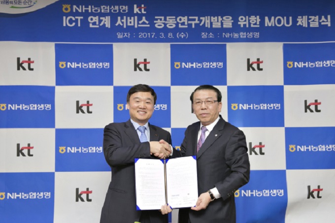 KT와 NH농협생명보험은 8일 서울 충정로 농협생명보험 사옥에서 개인 건강데이터 기반의 맞춤형 보험상품 발굴 및 핀테크, 헬스케어 등 신규 서비스 개발 협력을 위한 양해각서(MOU)를 체결했다고 밝혔다.