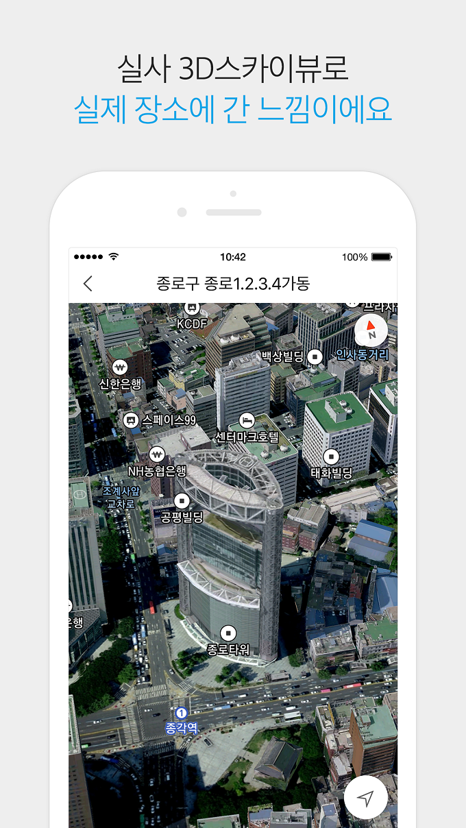 두 손가락을 화면에 대고 쓸어올리면 지도가 기울어지면서 건물의 높낮이가 입체적으로 표시되며, 두 손가락을 화면에 대고 돌리면 원하는 방향으로 지도를 회전시킬 수 있다. 지도의 동서남북 방향을 자유롭게 설정할 수 있고 건물의 형태나 높낮이를 확인할 수 있기 때문에 위치와 경로를 파악하기가 한층 용이하다.