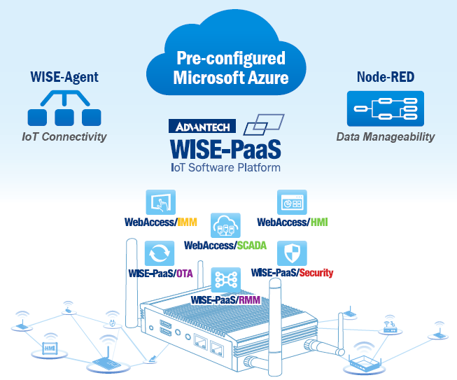에지 인텔리전스 서버(EIS)는 디바이스 관리, 중앙집중식 보안 관리, 인터랙티브 멀티미디어 콘텐츠 에디터, SCADA, HMI를 위한 WISE-PaaS 소프트웨어가 내장된, 즉시 실행 가능한 패키지다. WISE-PaaS는 어드밴텍의 IoT 플랫폼 소프트웨어 서비스로 원격제어, 시스템 보안, 사전 통합 클라우드 서비스 등을 제공한다. 그리고 마이크로소프트 Azure를 접목시켜 데이터 분석을 위한 하드웨어, 소프트웨어 통합 및 분석 도구를 제공한다는 것이 특징적이다.