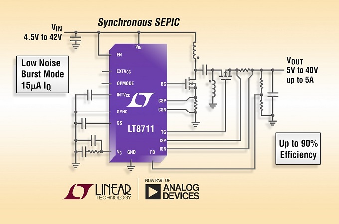 아나로그디바이스는 동기식 벅, 부스트, SEPIC 및 ZETA DC/DC 컨버터, 또는 비동기식 벅-부스트 컨버터로 손쉽게 구성 가능한 멀티 토폴로지 전류 모드 PWM 컨트롤러 신제품 LT8711을 출시했다.
