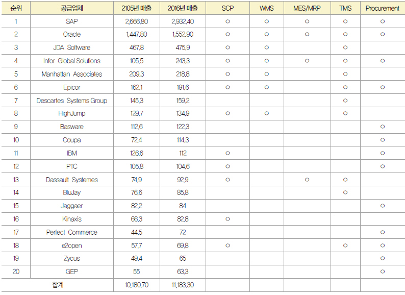 ▲ 표 1. 2016년 SCM 시장 전체 소프트웨어 매출 순위 (단위: 백만달러)