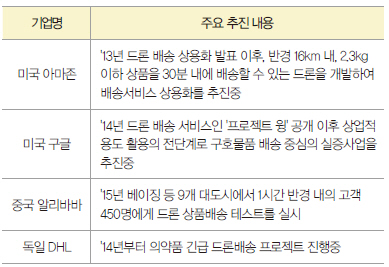 현재 아마존 등 글로벌 유통·물류기업은 인공지능·로봇·증강현실/가상현실(AR/VR) 등 4차 산업혁명 신기술 도입에 대대적인 투자를 하고 있는 가운데, 물류 서비스 혁신을 위해 드론 배송 상용화를 적극 추진하고 있다(표1).