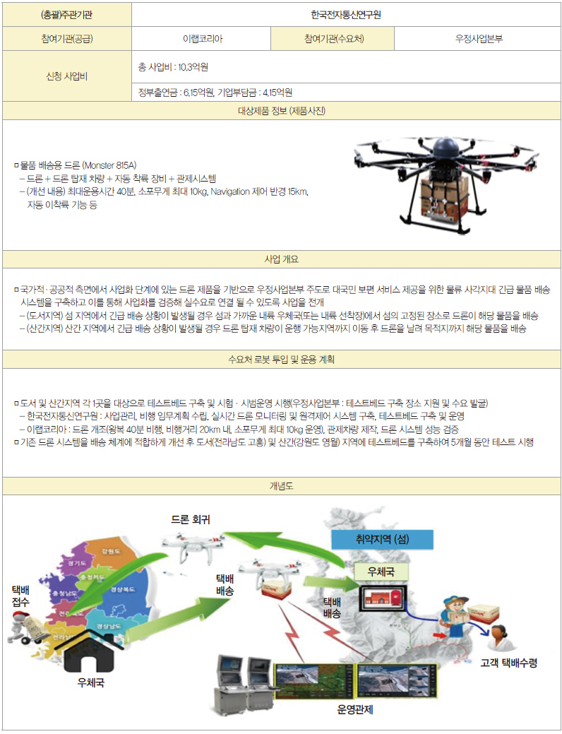 산업부는 ‘드론 기반 물품 배송 시스템 구축 사업’을 통해 드론 배송에 대한 기술성·안전성·현장 적용 가능성 등을 점검해 왔다. 기존 드론을 개조하여 물품 배송용 드론을 제작하고, 우정사업본부의 우편 배송 시스템과 연계한 드론 배송 시스템을 구축하였으며, 도서(전남 고흥), 산간(강원 영월) 지역 2곳에서 모의 우편물을 배송하는 시험 운영기간을 거쳤다.