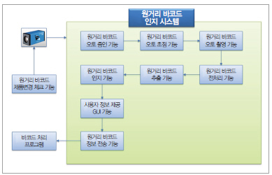 ‘원거리바코드 인식 기술’의 상세 사양을 보면, ▲Windows 7 환경에서의 프로그램 시작 기능 ▲바코드 촬영을 위한 제품변경 체크 기능 ▲바코드 이미지 크기 조절을 위한 줌인/줌아웃 기능 ▲원거리바코드 카메라 오토 초점 제어 기능 ▲원거리바코드 카메라 오토 촬영 제어 기능 ▲원거리바코드 이미지 전처리 기능 ▲원거리바코드 이미지 추출 기능 ▲원거리바코드 정보 인지 기능 ▲원거리바코드 사용자 프로그램 테스트용 GUI 기능 ▲원거리바코드 인지후 바코드 정보 전송 기능 ▲2D바코드(QR코드) 인식 기능 ▲원거리바코드 인지 오류율 1% 이내 기능 ▲원거리바코드 인지 응답시간 1 초 이내 기능 ▲원거리바코드 인지 거리 2m 이내 기능 등으로 요약된다.