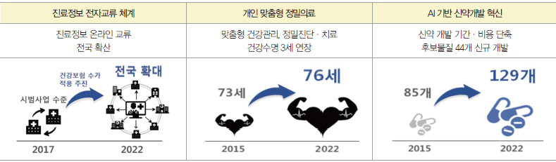 인공지능 기반의 개인 맞춤형 정밀진단·치료 구현, 신약 개발주기·비용 단축, 세계 최초 외부조종 캡슐내시경 개발·상용화 등으로 국민의 건강수명을 3세 연장하는 한편 미래 먹거리 산업을 창출키로 했다.