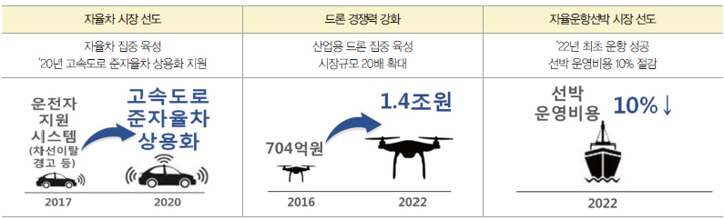 이동체의 경우, 자율차·자율운항선박·드론 등 스마트이동체 선도국가 도약에 방점이 찍혔다.