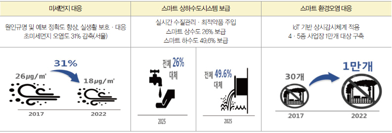 미세먼지에 대응, 인공지능·빅데이터 기술을 활용한 미세먼지 원인규명, IoT 기반 측정 제도화, 원인물질 제거장치 개발 등을 통해 오염도를 대폭 감축시키고, 실시간 IoT 측정자료 기반의 스마트 상하수도 시스템을 확산하여 시설운영의 효율화와 안전성을 제고키로 했다.