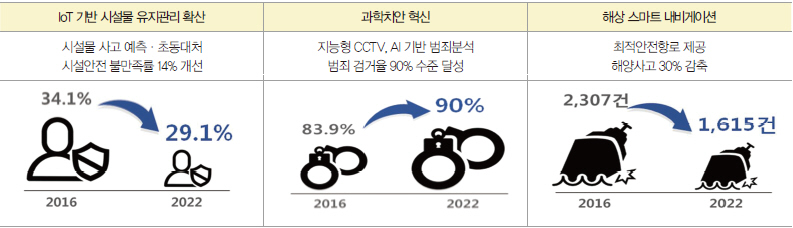 안전사고에 대응, 노후 시설물 유지관리 IoT 시스템을 개발 적용하고, 최적안전항로를 지원하는 해상 스마트 내비게이션을 全선박에 보급키로 했다. 지능형 CCTV 및 인공지능 기반 범죄 분석, 드론 기반 자율순찰·추적 등을 개발하여 범죄발생 취약지역에서 실증키로 했다.