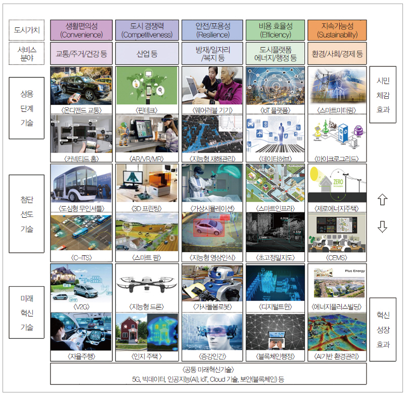 국가 시범도시에는 차세대 네트워크, 빅데이터, AI 등 미래 공통 선도기술부터 자율주행, 스마트그리드, 가상현실 등 체감기술까지 집중 구현하고, 이에 대한 실증·상용화도 함께 추진한다. 기존 도시와 노후도심에는 국민이 쉽게 체감할 수 있는 교통, 에너지, 환경, 행정, 주거 등 관련 분야의 상용화된 기술들을 확산한다.
