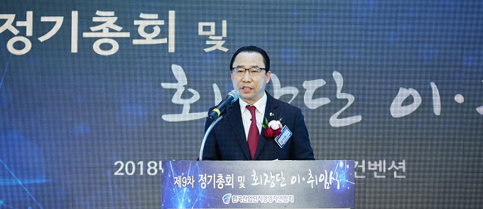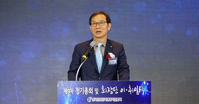 ▲2월 27일, 서울 지밸리컨벤션에서 제5대한국산업단지경영자연합회 김기원 회장이 취임사를 하고 있다.