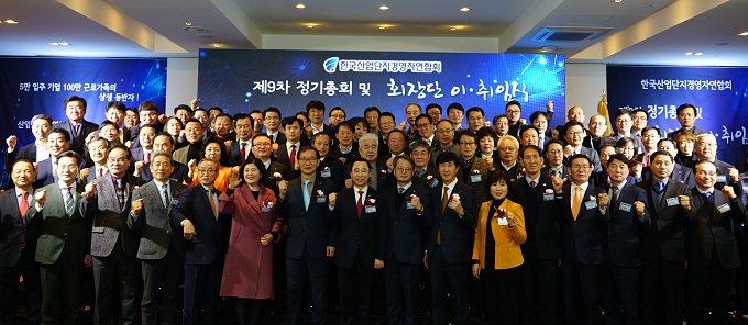 ▲제9차 한국산업단지경영자연합회 정기총회 및 회장단 이임식을 마친 후 회원사들이 기념촬영을 하고 있다.