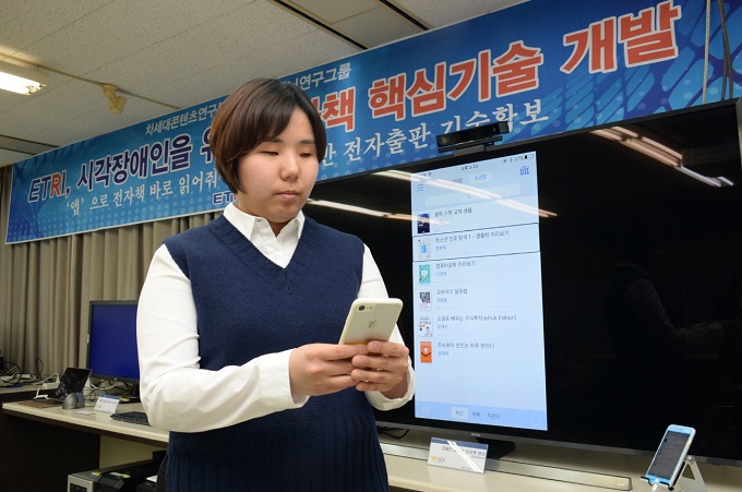 ETRI가 개발한 전자책 리더 기술을 활용해 양주혜(시각장애인 1급)씨가 전자책(eBook)을 듣고있는 모습