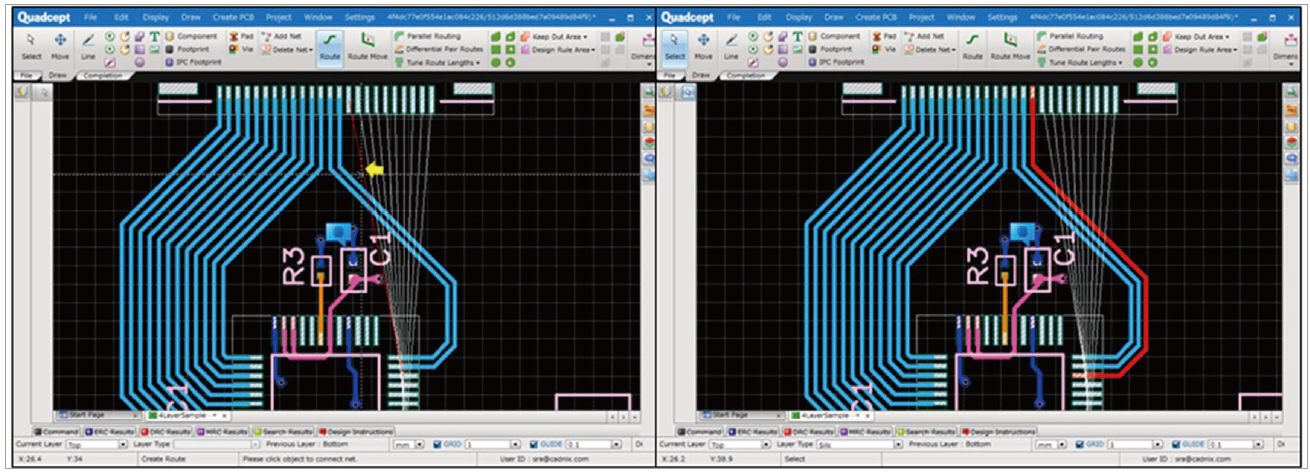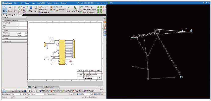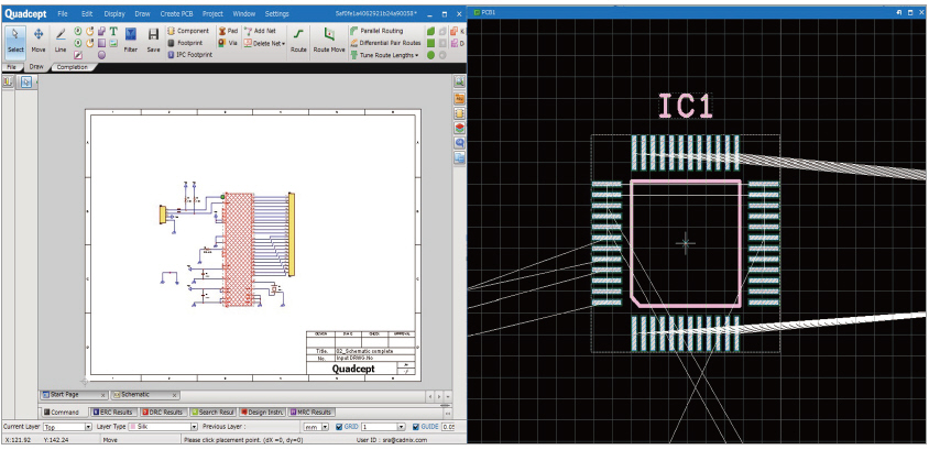 쿼드셉트에는 일반적인 Move 배치 기능 외에, [Place PCB Component]라는 기능이 존재한다. 회로도와 PCB 양쪽에 연동되어 작동하는 부품 배치 기능으로, 회로도에서 배치하고자 하는 부품을 선택하면 자동으로 PCB창에서 선택된 부품의 풋프린트(Footprint)가 마우스 커서 끝에 붙는 기능이다. 마우스 커서 끝에 풋프린트(Footprint)가 붙고 나면, 원하는 위치에 부품을 배치하면 된다. 부품이 배치되는 순간 다시 한 번 회로도 화면으로 창이 전환되는데, 다음 배치할 부품을 선택하면 된다. 한번에 여러 개의 부품을 선택할 수도 있는데, 회로도상에서 여러 부품을 드래그해 선택하면 선택된 부품이 PCB에서 차례로 마우스 커서 끝에 달라붙게 된다. 마찬가지로 원하는 곳에 첫 번째 부품을 배치하고 나면 다중 선택된 부품 중 다음 부품이 순서대로 마우스 커서 끝에 달라붙게 된다.