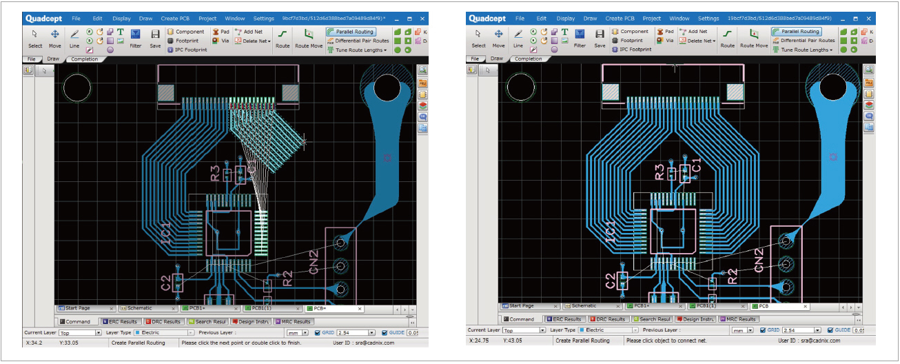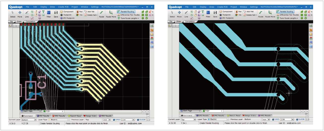 배선을 편리하게 할 수 있는 기능 중 Data Line 다발이나 Address Line 다발을 동시에 끌고 나갈 수 있는 [Parallel Routing] 기능과, 가이드 배선을 따라 자동으로 배선되는 [Semi Auto Routing]이 있다. 먼저 [Parallel Routing]은 원하는 간격을 설정하고 배선을 시작하면, 선택된 배선들이 설정한 간격을 유지하며 마우스 커서 끝에 붙어 따라오게 된다. 배선이 그려지는 도중에 일괄 Via 삽입과 일괄 배선 두께 변경이 가능하다. Via가 삽입될 때, Via간 간격과 Via와 배선간 간격은 DRC-Clearance 항목에 설정된 내용에 따라 해당 간격이 유지된다.