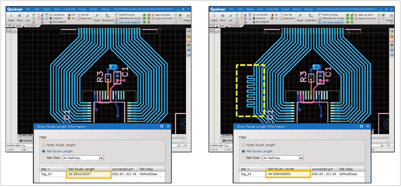 배선 후에 배선 길이를 원하는 길이만큼 늘려주는 기능이 있다. 일반 Single Net이나 Differential Net 모두 적용이 가능한 기능으로 Net 선택 후 원하는 길이를 입력하고, Serpentine(구불구불한 모양으로 생기는 배선 형태)의 상세 크기를 설정하고 나면 선택된 Net에 원하는 길이만큼 Serpentine 형상을 그려 넣을 수 있다.