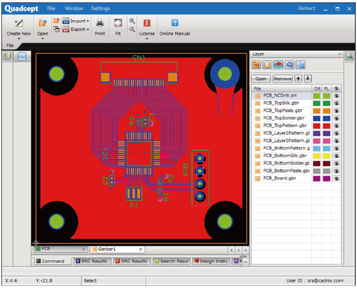설계 데이터에 대한 Gerber 파일을 출력하고 나면, Gerber Viewer를 통해 출력된 Gerber의 상태를 확인할 수 있다. Quadcept에서 출력된 Gerber 파일 뿐만 아니라 Drill 데이터(NC Drill)와 타 전자회로설계 프로그램에서 출력된 RS-274X형식의 Gerber 파일도 읽어볼 수 있어 설계된 Gerber 파일을 열기 위해 별도의 Gerber Viewer 프로그램을 사용하지 않아도 된다.