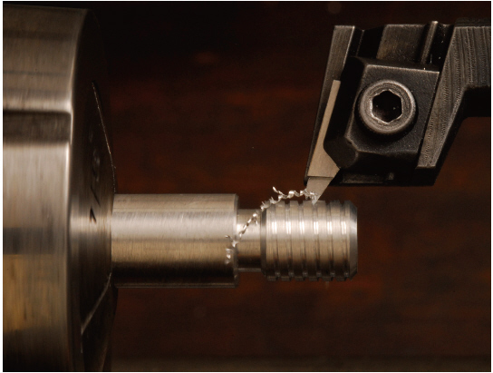 칩 처리성(배출성)을 좋게 하려면 <그림3>과 같은 칩을 홈 폭보다 좁게 하여 태엽 모양으로 처리할 수 있는 3차원 칩 브레이커가 붙은 바이트를 사용하면 좋다. 특히 지름이 큰 공작물 절단에는 효과적이다. 또 이송을 스텝 이송으로 하여 칩을 절단하는 방법도 많이 쓰이고 있다.