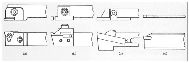 (a)는 3코너 팁을 쓸 수 있어서 경제적이므로 홈절삭 가공의 주류로 되어 있다. 팁의 재질도 초경 팁에 더하여 내마모성, 내용착성이 우수한 서멧이 많이 쓰이고 있다. (b)는 비교적 홈 폭이 크고 깊은 홈 가공에 사용된다. (a), (b)는 홈절삭 가공용으로 주로 쓰이며 같은 클램프 형식의 내경 홈절삭 가공용 바이트, 단면 홈절삭 가공용의 바이트도 많이 나오고 있다. (c)는 초경 블레이드 클램프 방식으로 초경 블레이드는 재연삭하여 사용된다. 또 (d)는 팁의 클램프가 홀더의 쐐기 힘에 의하여 이루어지며, 클램프 강도, 칩 처리, 최대 절단 지름, 코팅 재종의 사용 등 여러 가지 이점이 있기 때문에 널리 쓰이고 있는 것이다. 이 (d) 타입의 바이트는 홀더 강성을 향상시키기 위하여 홀더를 초경제로 만든다.